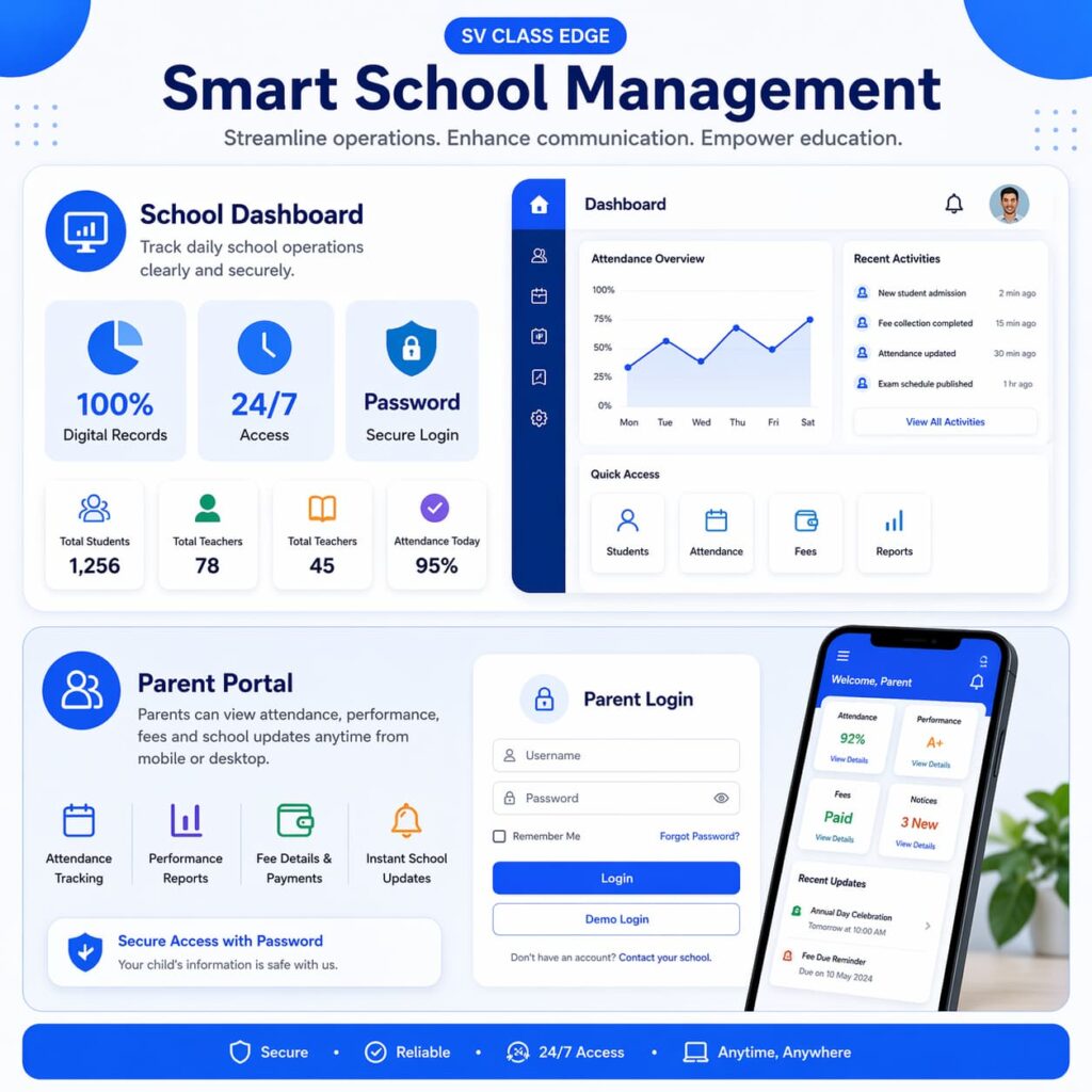 Many schools still manage student records, attendance, fees and announcements through registers, spreadsheets or multiple disconnected tools. SV Class Edge brings everything together in one simple platform.